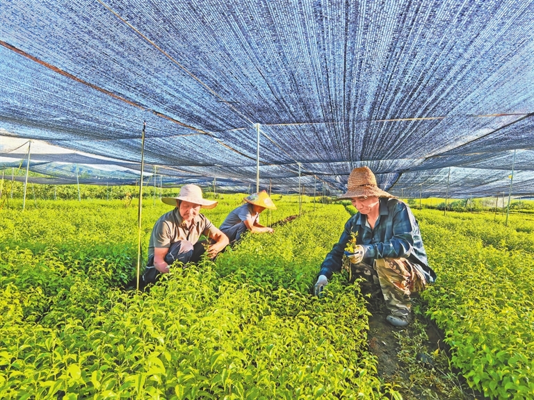 近年来,乐平市深化集体林权制度改革,充分利用林下空间推广“林药套种”,实行“公司+基地+农户”形式,使得岗梅成富民“金钥匙”,该市成为全国岗梅供应集散中心。图为当地村民正在岗梅繁育基地培植种苗。