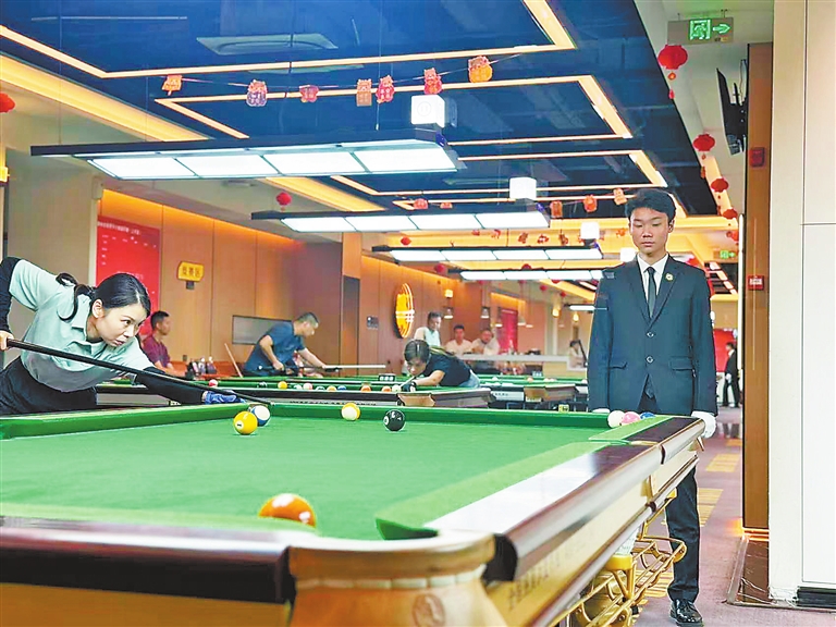 邱小波此前是一名媒体工作者,近两年转行经营台球馆。他开办的金杆荣耀台球俱乐部堪称台球综合体的典范。除了28张标准球台外,还设有餐饮区、观赛区和棋牌包间,40多名员工提供从点餐到陪练的一站式服务。“以前靠台费盈利,现在商品销售和教练服务占比达40%。”暑假期间,他的俱乐部日均营业额超2万元,比平时翻了一番。