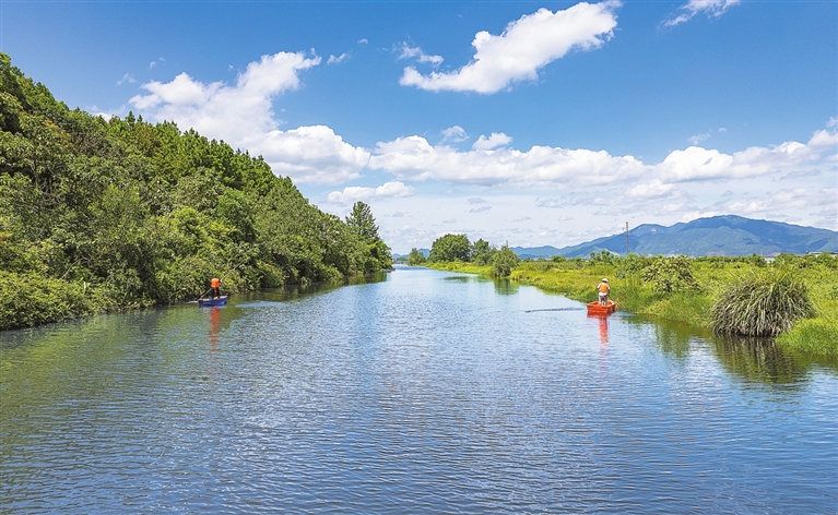 近年来,新余市坚持生态优先、绿色发展,全面落实河湖长制,全力保护水环境、改善水生态,绘就河畅、水清、岸绿、景美的生态画卷。图为8月15日,河道保洁员在渝水区蒙河水北段巡视水面,清理漂浮物。 本报全媒体记者 邹宇波摄