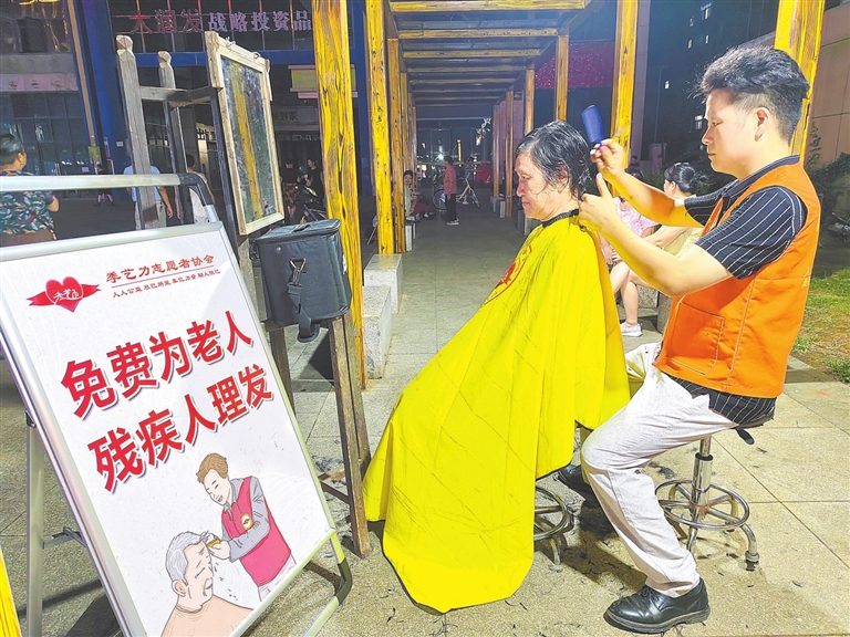8月13日晚,在进贤县街心花园,季艺力志愿者服务协会会长季亮带领志愿者开展“免费为老人、残疾人理发”活动,为城市增添一抹温暖的亮色。通讯员 樊哲平摄