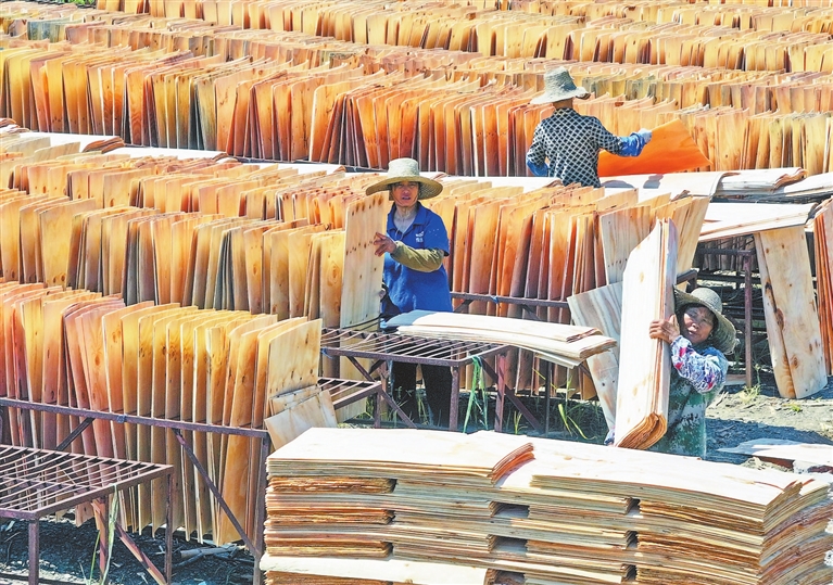 泰和县以林长制为抓手积极发展林业经济,利用木材边角料、山场清理的杂木树枝等废料,变废为宝,生产加工板材,助力林农增收。图为8月26日,当地板材生产加工厂,工人正晾晒板材。特约通讯员 邓和平摄