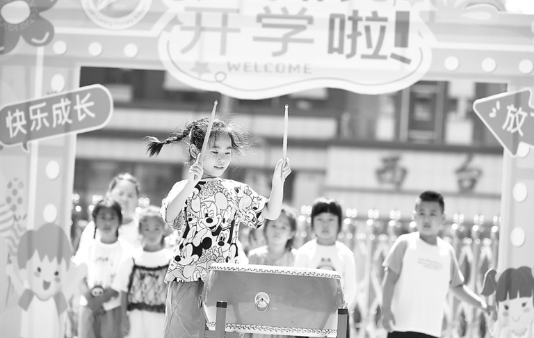 9月1日,山东省淄博市沂源县鲁阳小学新入校的小学生在开学第一课上击鼓鸣志。当日,全国多地中小学开学,师生迎接秋季新学期。新华社发(赵东山摄)