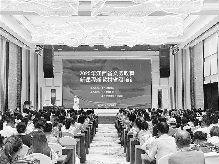 为进一步落实国家义务教育新课程方案和课程改革实施要求,促进教学改革,全面提高育人质量,7月3日起,江西省教育厅在全省开展2025年江西省义务教育新课程新教材省级培训。人教版新教材培训由人民教育出版社、江西教材经营有限公司承办,涵盖义务教育阶段语文、数学、英语、道德与法治等18门学科,得到我省各级教育部门的大力支持。本次培训采用“主会场+分会场”同步直播的创新模式,全省各地相关学科教研员和骨干教师等4400余人参加线下培训,线上直播观看达180万人次。