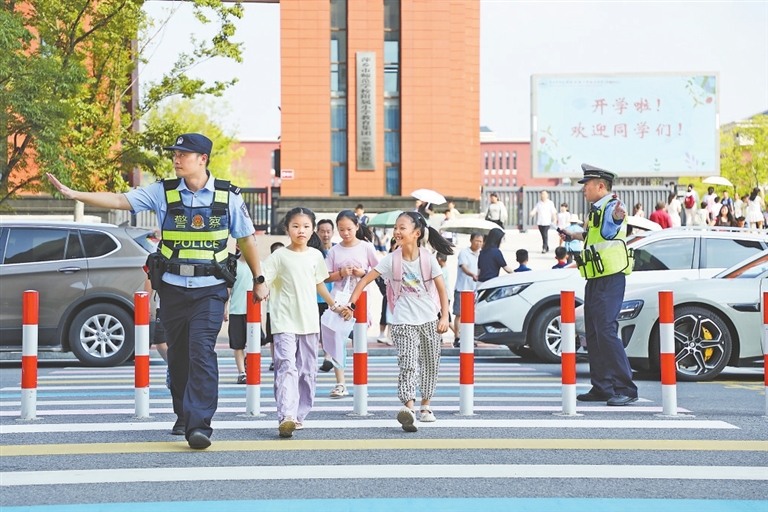9月1日,萍乡市各中小学校迎来开学季,该市公安局交管支队各大队提前在辖区各学校门口及周边重点路口路段部署警力疏导交通,护送学生有序通行。