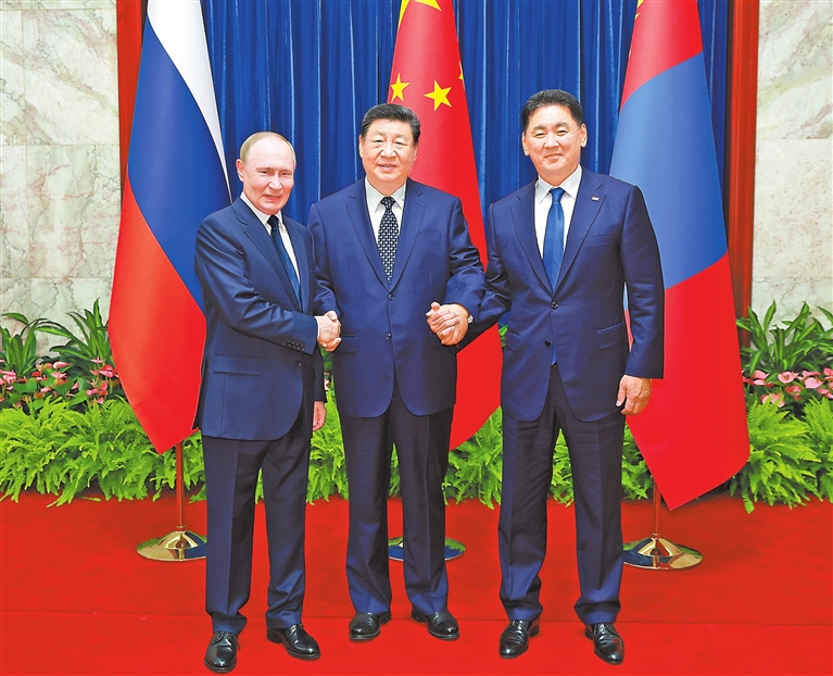 习近平指出,近年来,中俄蒙三方合作稳步发展,取得实实在在的成果。三方合作中期路线图顺利实施,三国贸易额节节攀升,经贸、科技、生态保护、人文合作不断深化。作为山水相连、休戚与共的友好邻邦,中方愿同俄方、蒙方一道,坚守合作初心,排除外部干扰,携手推动三方合作高质量发展。