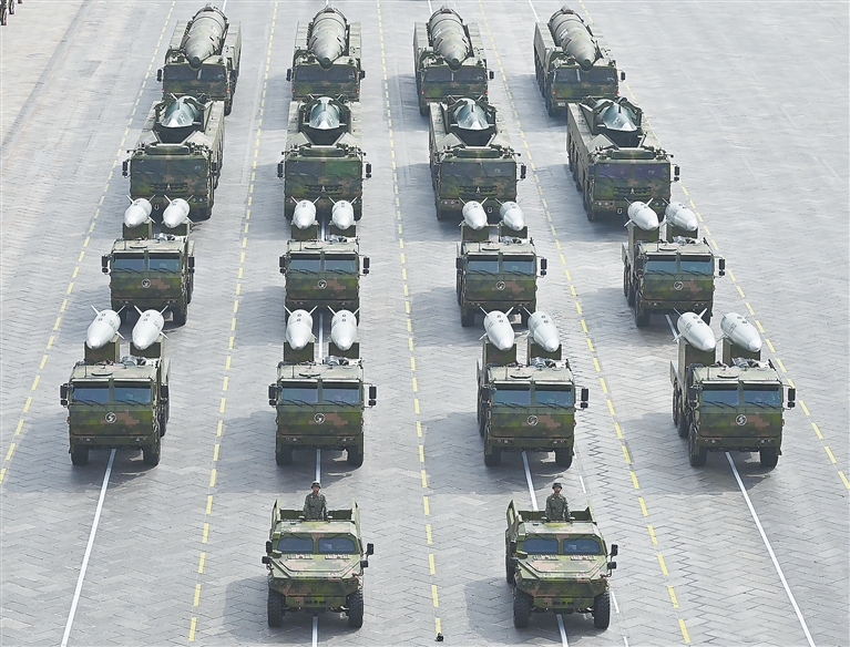 以快制强,极速打击。高超声速导弹方队受阅的鹰击-21、东风-17、东风-26D导弹,飞行速度快、突防能力强、命中精度高,是具备全天候作战能力的新型杀手锏。