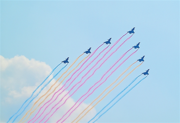 空军八一飞行表演队驾驶歼-10表演机,以超密集编队出场。7架战机在空中划出14道彩烟,寓意着中华民族14年可歌可泣的抗战历程,象征着14亿多中国人民奔向强国复兴的绚丽前景。