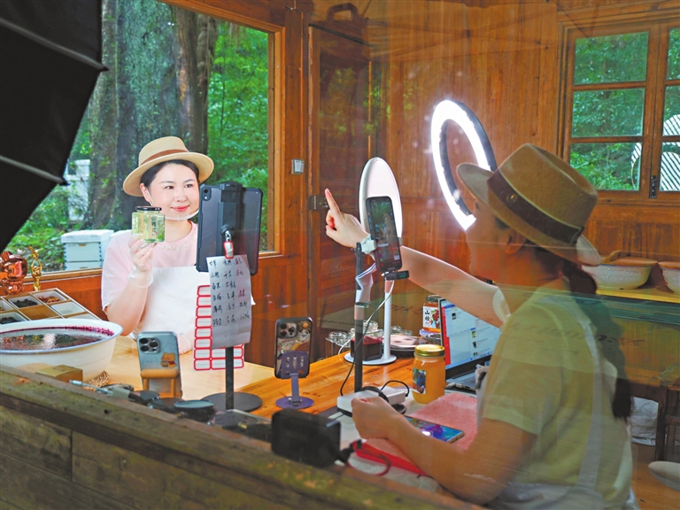 永修县深山蜂谷盛产山乌桕蜂蜜。近日,随着蜂蜜大量上市,除了传统的实体门店销售渠道,养蜂企业纷纷通过自媒体、网络直播带货等方式,将直播间搬进山下林间,在产蜜一线开拓网络市场,助推蜂蜜产品线上销售。图为主播正向消费者介绍蜂蜜。