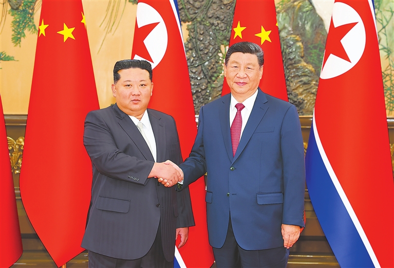 习近平指出,中朝是命运与共、守望相助的好邻居、好朋友、好同志。中朝友谊源远流长,两国都是共产党领导的社会主义国家,有着共同的理想信念和奋斗目标。金正恩总书记来华出席纪念中国人民抗日战争暨世界反法西斯战争胜利80周年活动,体现了朝方维护二战胜利成果的坚定意志,也为中朝两党两国进一步发展友好合作关系提供了重要契机。