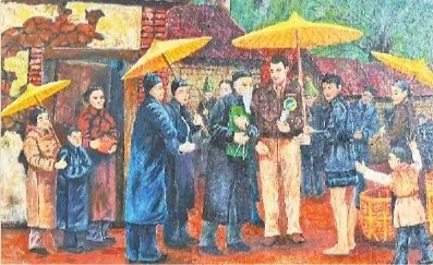 几易其稿,托马斯终于完成了油画作品《父亲与广丰村民》,并寄到了上饶。在画里,十多名村民簇拥着飞行员,儿童在一旁嬉戏;那位马西亚念念不忘、未留下姓名的年轻人,被托马斯画在了父亲身旁,手上撑着油纸伞……
