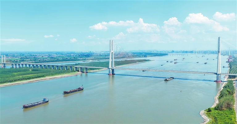 8月29日,九江经济技术开发区鳊鱼洲长江大桥附近江面上,各类船舶往来穿梭,有序航行。特约通讯员 魏东升摄