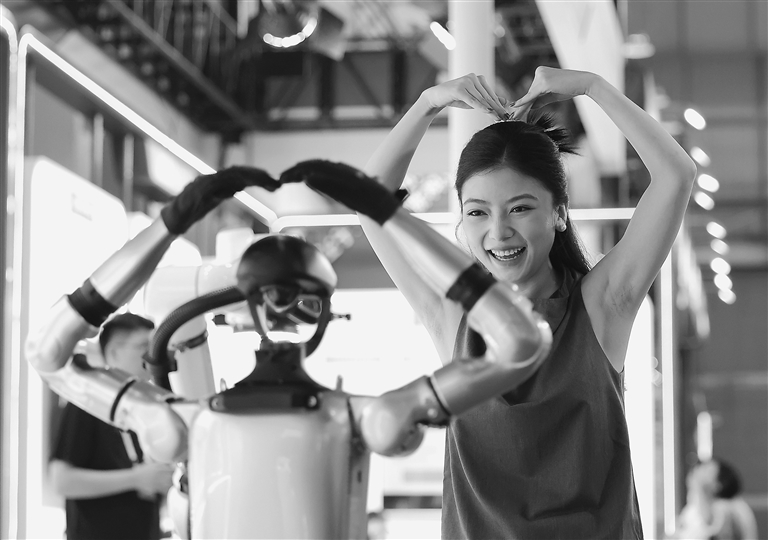 9月6日,2025全球工业互联网大会在沈阳开幕。大会以“数启新章 智造新质”为主题。活动期间,工业互联网供需两侧头部企业云集沈阳中国工业博物馆,展示人工智能、大模型等前沿技术和设备在工业领域的应用场景。大会聚焦相关行业数字化、智能化、绿色化发展,将举行20多场论坛和专题交流活动。图为在2025全球工业互联网大会展览区,参会嘉宾和智能机器人互动。