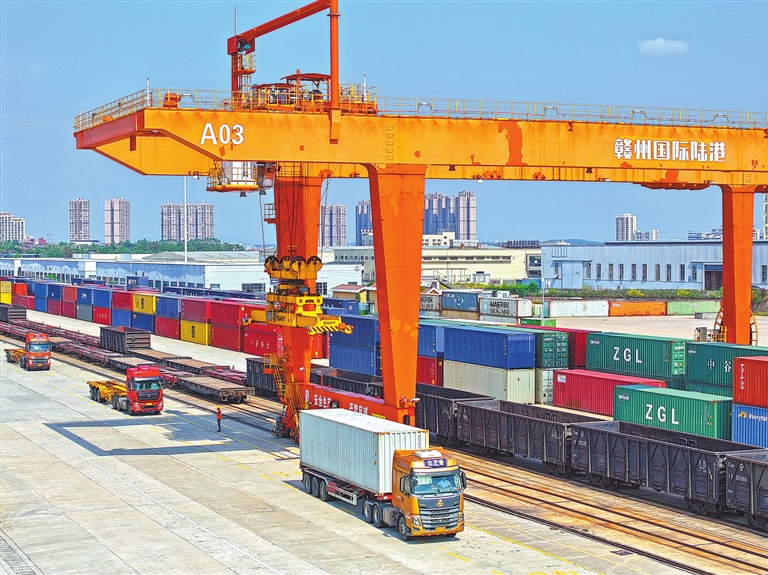 9月5日,赣州市南康区,赣州国际陆港货场内一排排集装箱整齐码放,龙门吊往来穿梭,一派繁忙景象。目前,赣州已开通至深圳、广州等5条铁海联运线路,累计开行中欧班列突破2万列,覆盖欧洲22个国家的151个城市。