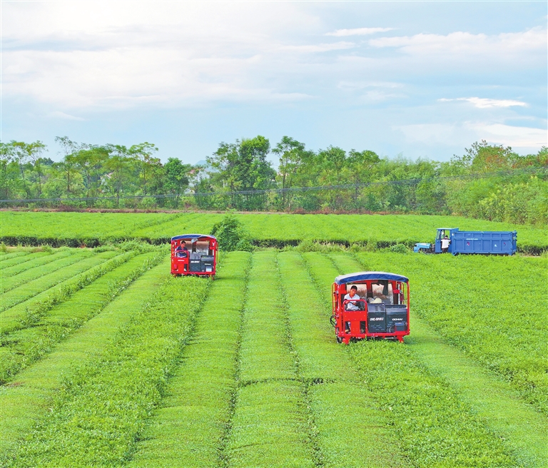 9月8日,泰和县泰和垦殖场茶园,工人驾驶智能采茶机采收秋茶。