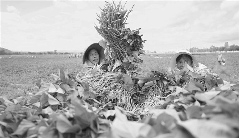 9月9日,在永丰县佐龙乡罗富村的甘薯苗繁育基地,一排排嫩绿的甘薯苗长势喜人,工人们正手持工具熟练地采收首批种苗。通讯员 袁雪彬摄