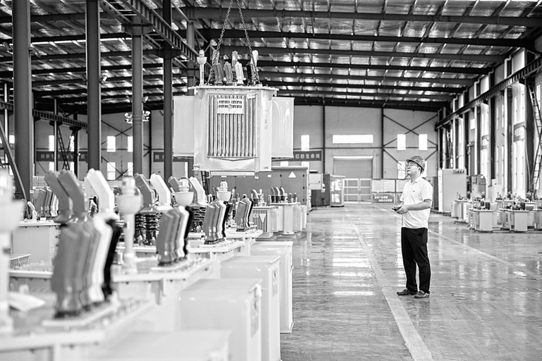 近年来,崇仁县通过技术创新驱动产业迭代升级,实现从传统制造基地向智能制造高地的转型,为县域经济高质量发展提供了强劲动能。图为9月11日,在崇仁高新区的江西伊发电力科技股份有限公司,员工正在吊运变压器。