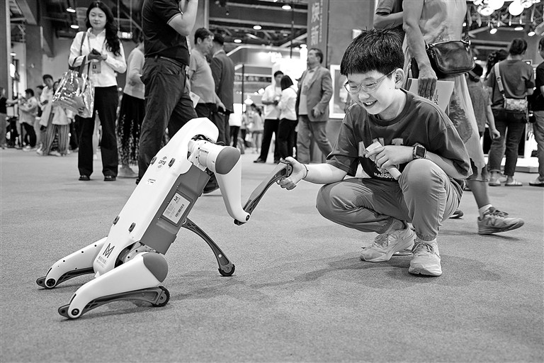 9月13日,小朋友与机器狗握手。