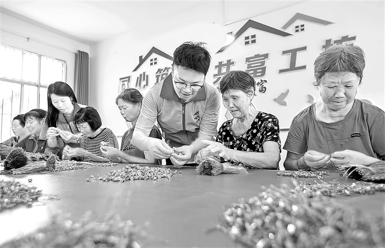 峡江县福民乡以党建为引领,引进开发包装、非遗手作等特色增收项目,打造“银发共富工坊”,已带动120余名老人就业增收。图为近日,在福民乡宋家村“银发共富工坊”,老人们正专注地组装灯串。本报全媒体记者 徐 铮摄