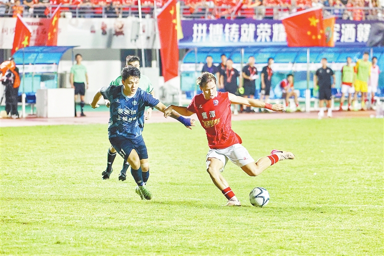 9月13日晚,鹰潭市体育中心体育场,在赣超第十轮比赛中,鹰潭队主场3∶0完胜景德镇队,迎来赛季首胜,仍无缘淘汰赛。图为鹰潭队球员尝试远射。本报全媒体记者 徐 铮摄