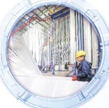 中铭新材料科技股份有限公司车间里,智能设备高效运转,电子看板则实时更新着生产进度、质量数据及设备运行状态,工人们正专注地操作设备,加紧生产一批铝合金门窗和幕墙。