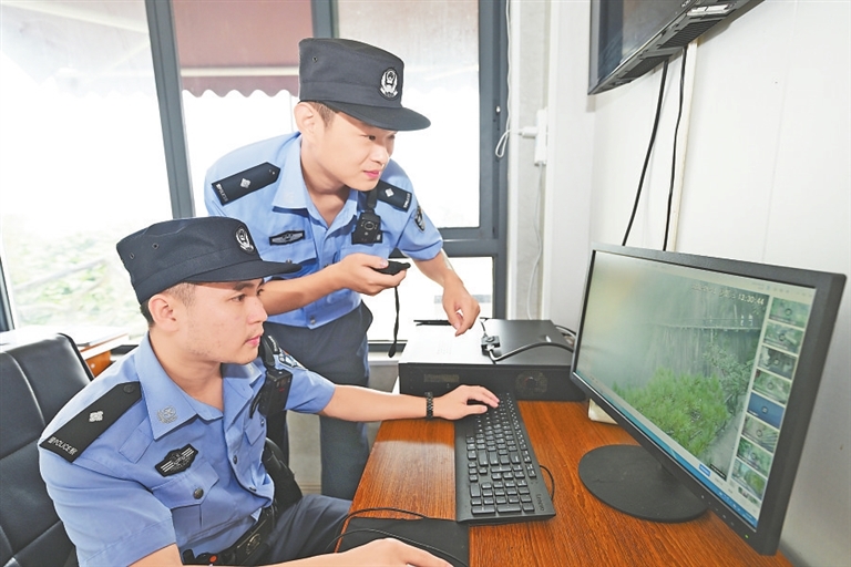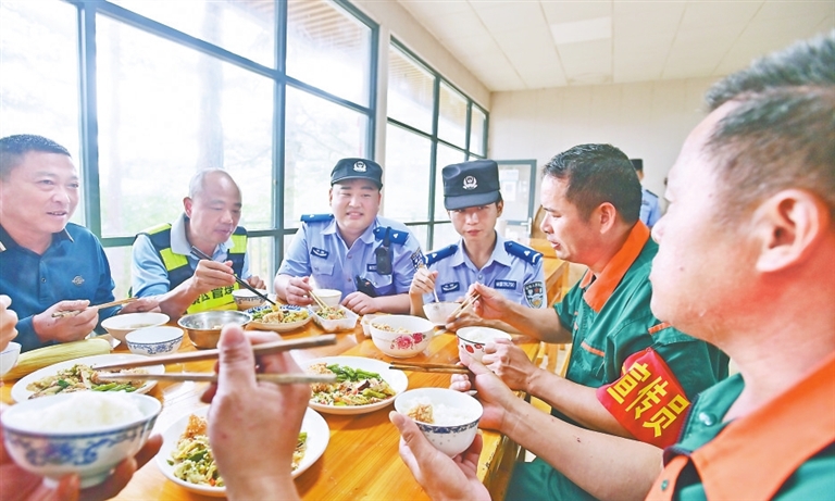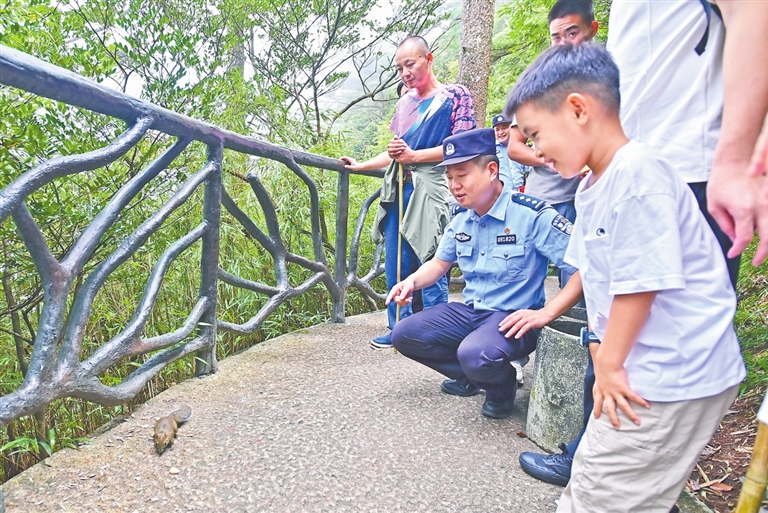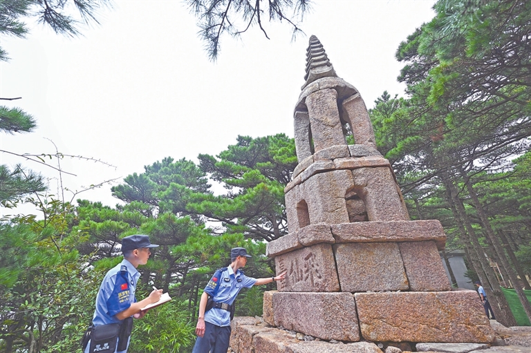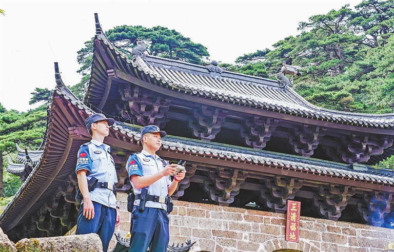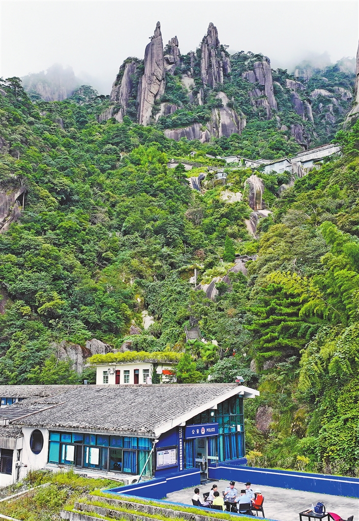 除了是服务游客的驿站,警务室还是绿水青山的守护哨。三清山上分布着完整、典型的亚热带原生森林,是大量古老、特有和珍稀濒危物种的重要栖息地。“这里有千亩松林和万亩华东黄杉群落,三清宫还是全国重点文物保护单位。”民警朱震一边在林间巡逻,一边介绍,“三清宫警务室设立在高海拔、游客稀少的三清宫旁,主要就是为了防火。物防、技防再加上人防,我们心里才踏实。”