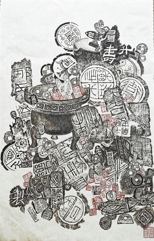 画罢晾在案头,看那些全形拓、砖铭、印花、瓦当在纸上相依相偎,忽然懂了“锦灰”的意思:原是把时光嚼碎了,又用笔墨粘起来,让那些散落在岁月里的碎片,在纸上重新长出筋骨,生出温度。(图片为作者锦灰堆作品)