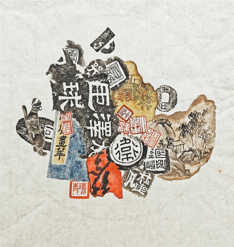 我画锦灰堆,从无预设。一纸残拓、半角旧印,都能作为起笔的由头,随形就势,渐次生发。画面的大小、聚散、叠压,全在运笔间自然调整。有时会把自己钟爱的残纸拓片糅入画中,偶尔添几笔亲手拓的纹样——仿佛这样,便与那一堆旧物有了血脉牵连。画拓片时,我总在揣摩器物质感:摹画封泥,就取一方真品放在案头,指尖摩挲它的粗粝;描绘砖瓦,耳畔仿佛又响起拓包叩击砖面的闷响,眼前浮现出墨色渐渗的纹理。至于文字,偏爱挑选梵文、满文、八思巴文之类冷僻的;残画则多取山水,尤其喜欢用枯笔扫出枝叶婆娑之态,似有风穿缝隙而过。印章也是如此,近来常观赏汉印、明清流派印,以及自己和朋友们的常用印,总会不知不觉将其潜入画角。