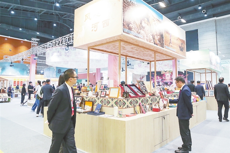 ▲◀9月21日,与会嘉宾在博览会上参观甘肃文旅非遗文创展。