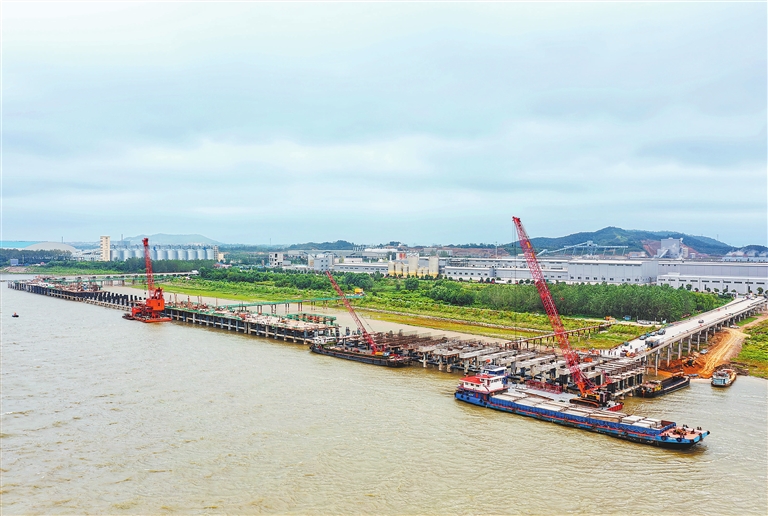 九江港湖口港区银砂湾作业区公用码头项目位于长江湖口水道中下段右岸,共建设5个5000吨级泊位,全长656米,设计年通过能力730万吨,预计2027年初投入使用,这将进一步优化当地港口运输结构。图为9月18日,建设中的港口码头。