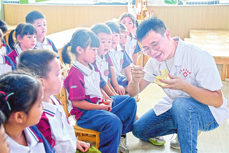 今年全国爱牙日前夕,9月19日下午,在南丰县第三幼儿园大(2)班,该县中医院口腔科医生正为幼儿讲解口腔卫生知识,培养他们良好的口腔卫生习惯。通讯员 袁荣生摄