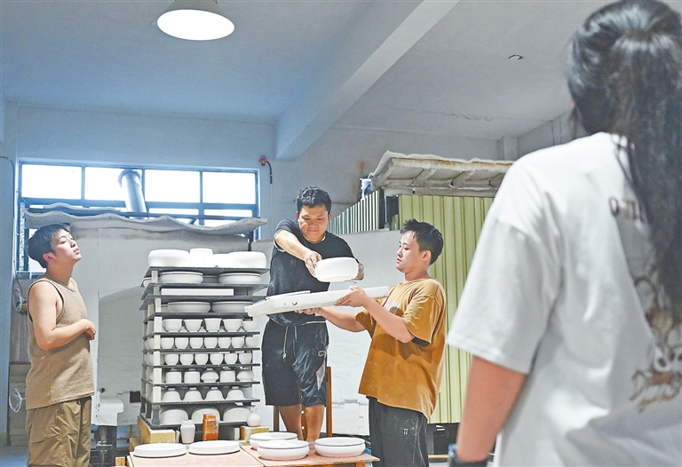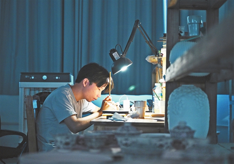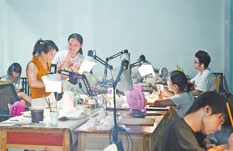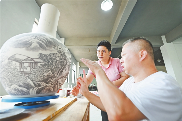 9月8日,位于景德镇的博爱陶瓷文化交流中心,只见20余名听障陶瓷工匠正沉浸在创作中。看,有人正在勾线,笔锋如游龙走凤,有人正在分水,青料在笔端浓淡相宜。闻,空气中弥漫着瓷土特有的清香,与墨料的醇厚气息相互交织。听,只有笔锋与瓷面摩擦的细微声响,如春蚕食叶,绵密而富有韵律。这群陶瓷工匠的世界虽然寂静无声,手中的画笔却流淌出绚丽多彩的艺术生命。这里是他们追逐梦想的起点,也是全国自强模范张玲用陶瓷艺术为残障人士开辟的希望天地。