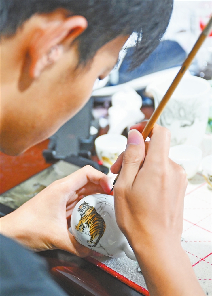 中心另一侧,粉彩工匠笔尖轻旋细捻,线条遒劲舒畅,勾勒出一幅猛虎下山图,栩栩如生。“寂静让我们的视觉更敏锐,也更加专注和细心,我们订单产品合格率很高,合作商很满意。” 张玲用手语向记者解释,眼神中流露出自豪。听障陶瓷工匠陈振豪研究生毕业于长春大学,多方打听后,来到博爱陶瓷文化交流中心继续学习和创作。“这里有志同道合的朋友,还有很好的创作氛围。”陈振豪停下创作的画笔,用手语介绍道。