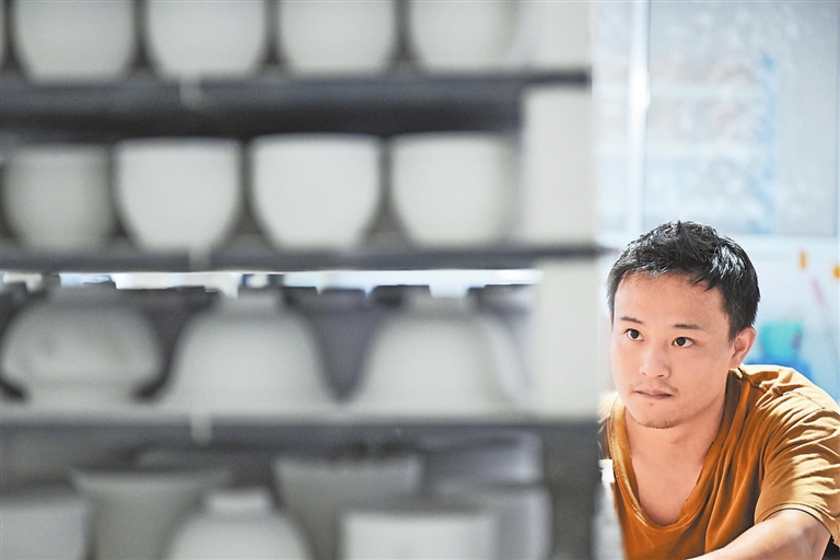 窑房里,中心老窑工杨明耐心地调整装烧瓷器的位置,确保每件作品的火候恰到好处。他用手语比划着:“窑位如棋局,每一步都要斟酌。”他和同为听障人士的妻子付江婷以及众多听障陶瓷工匠打造了一个默匠造瓷器品牌“春松窑”,他们期待这个由残障群体创立的元青花艺术品牌能出圈出彩。