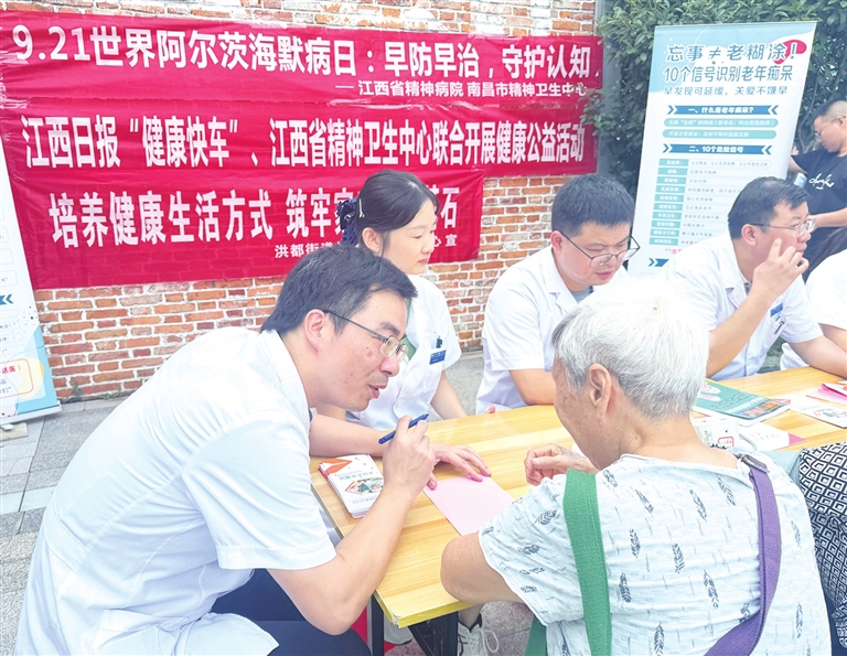 9月18日上午,江西日报“健康快车”联合江西省精神卫生中心(江西省精神病院、南昌市精神卫生中心)在南昌市青云谱区洪都街道社区卫生服务中心开展健康公益活动。该院专家团队为广大市民提供专业的认知筛查、健康讲座、医疗服务等,让群众更深入地了解阿尔茨海默病,提高对该疾病的预防和治疗意识。过江帆摄
