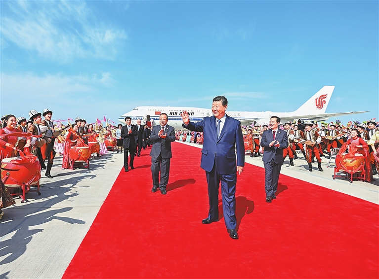 新疆维吾尔自治区党委书记陈小江、自治区人民政府主席艾尔肯·吐尼亚孜、自治区人大常委会主任祖木热提·吾布力、自治区政协主席努尔兰·阿不都满金、新疆生产建设兵团政委何忠友等在舷梯下迎候。习近平走下舷梯时,少先队员献上鲜花。各族群众代表身着民族服饰,载歌载舞,欢迎总书记的到来,表达对总书记的衷心祝福。