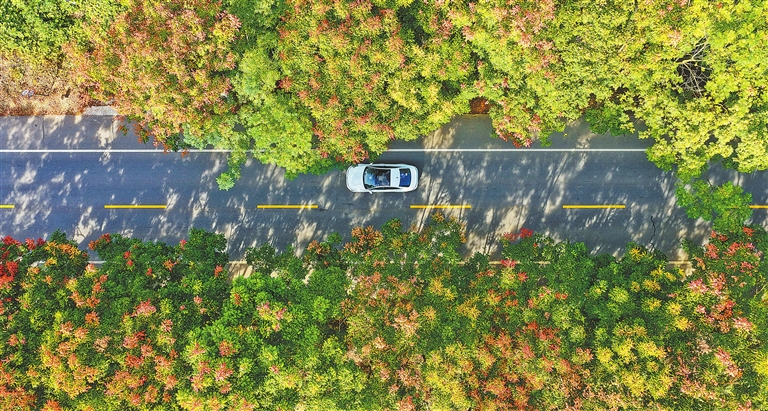 近日,上犹县东山镇广田村,汽车行驶在农村公路上,公路两侧的栾树陆续进入盛花期,风景宜人。特约通讯员 朱海鹏摄