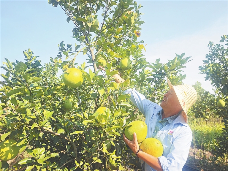 蓝天映衬下,在安义县东阳镇新华村朵云生态园里,果农在柚林间忙碌。满树翠绿的马家柚沉甸甸坠着,果农一手摘果、一手捧实,眉眼间的笑意,把丰收的甜意和劳作的踏实,都融在了这片果园里。王钇钰摄