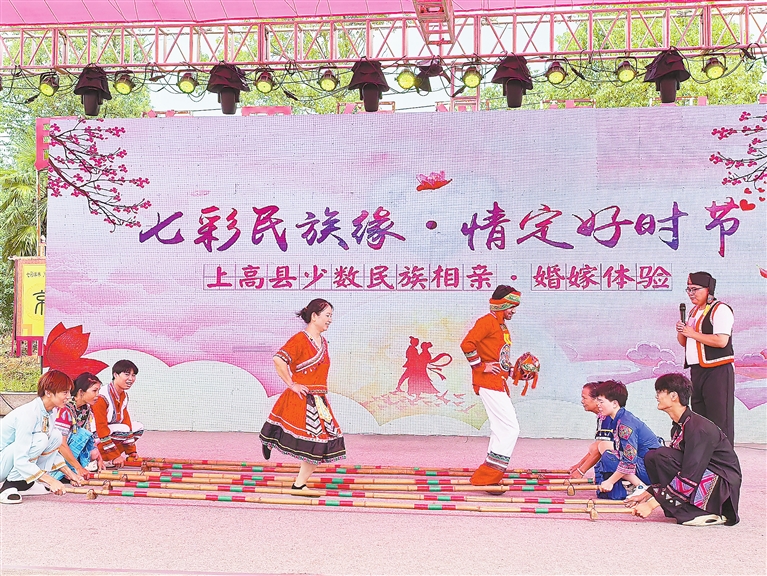 近日,上高县敖山镇洋林村举办少数民族文化展示活动,通过歌舞展演、书画展览、美食品鉴、泼水狂欢等丰富多彩的活动,让游客沉浸式感受文化魅力。图为宜春学院外国留学生体验洋林村的竹竿舞。本报全媒体记者 邹海斌摄