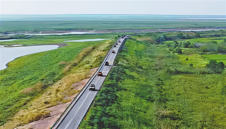 鄱阳湖地区是我国重要的洪水调蓄枢纽。为兼顾防汛抢险需求,鄱阳湖旅游公路在设计时,路面高出湖区安全运行上限水位1.96米,可作为防汛抢险的重要通道。