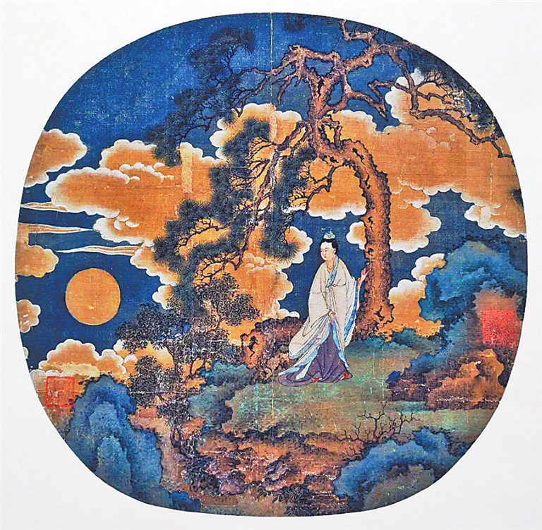 元代佚名的纨扇作品《嫦娥望月图》(图②,收藏于芝加哥艺术博物馆),直径约26厘米,以“女冠抚松”为场景,将嫦娥塑造为一位隐逸的女道士。画面中,虬曲的老松盘根错节,桂花枝从石畔斜出,夜空中祥云缭绕,一轮明月高悬。身着道袍的嫦娥立于高丘之上,头戴道冠,双手交叠于袖中,仰首望向明月,神情中透出超然物外的宁静。画家以商琦一脉的青绿山水技法勾勒山石,人物线条则借鉴了文人画的写意笔法。与宋代工笔重彩的华丽不同,此作通过淡雅的设色与简洁的构图,营造出“月出惊山鸟”的空灵意境。