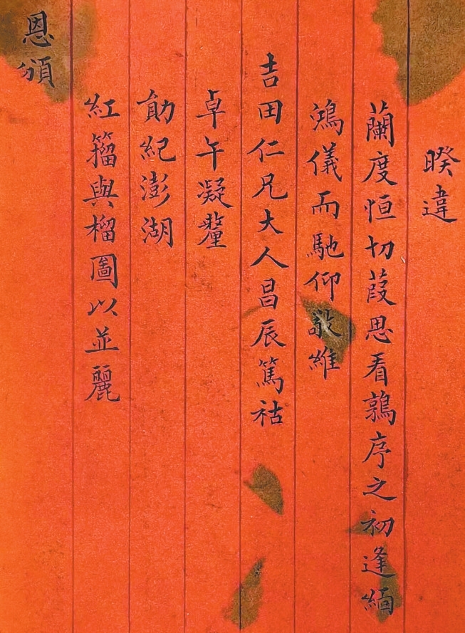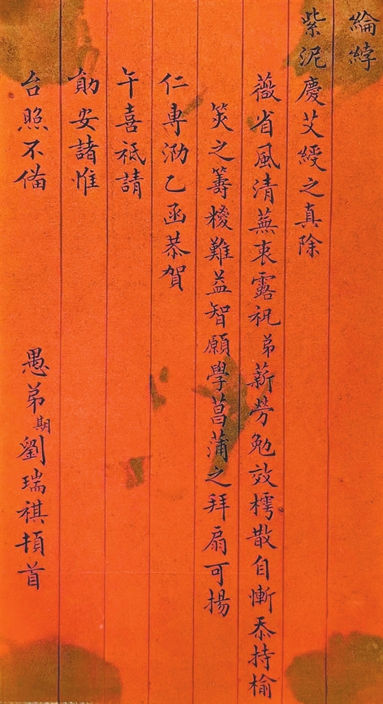 暌违兰度,恒切葭思。看鹑序之初逢,缅鸿仪而驰仰。敬维吉田仁兄大人,昌辰笃祜,卓午凝釐。勋纪澎湖,红籀与榴图以并丽;恩颁纶綍,紫泥庆艾绶之真除。薇省风清,芜衷露祝。弟薪劳勉效,樗散自惭,忝持榆荚之筹糭难益智,愿学菖蒲之拜扇可扬仁。专泐乙函,恭祝午喜;只请勋安,诸惟台照。不备。愚弟期刘瑞祺顿首。