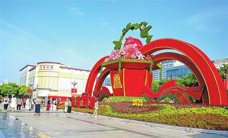 10月1日,游客在南昌八一广场“欢度国庆”主题花卉造型前拍照留念。这个巨型花坛占地约700平方米,高12.5米,由6万多盆花卉搭配而成,色彩缤纷,充满生机。本报全媒体记者 张翰林摄