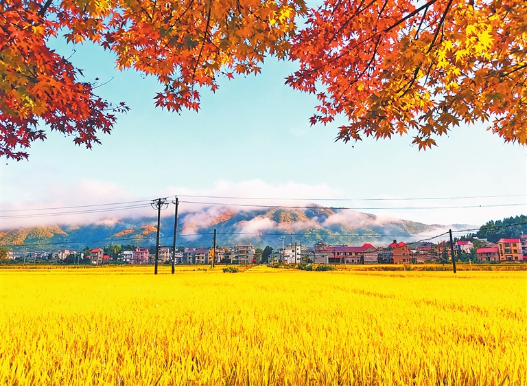 金秋时节的永新县澧田镇,稻田铺就金色绒毯,远山如黛云雾缭绕,红瓦村舍点缀其间,在光影下呈现出油画般的质感。