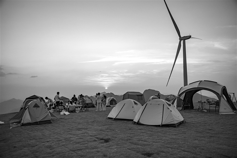 10月2日,位于横峰县葛源镇的米头尖露营基地迎来客流高峰,游客们观看日落,感受露营乐趣,乐享假日生活。
