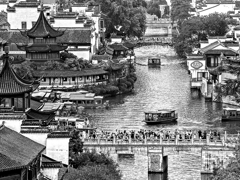 图①:10月7日,游客在江苏省南京市秦淮区的夫子庙景区休闲游玩(无人机照片)。 新华社记者 李 博摄