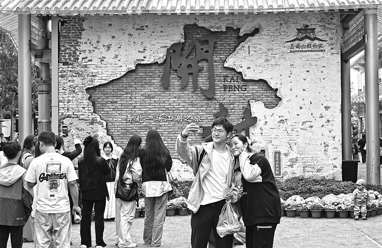 图②:10月7日,游客在河南省开封市万岁山武侠城拍照游玩。 新华社记者 郝 源摄