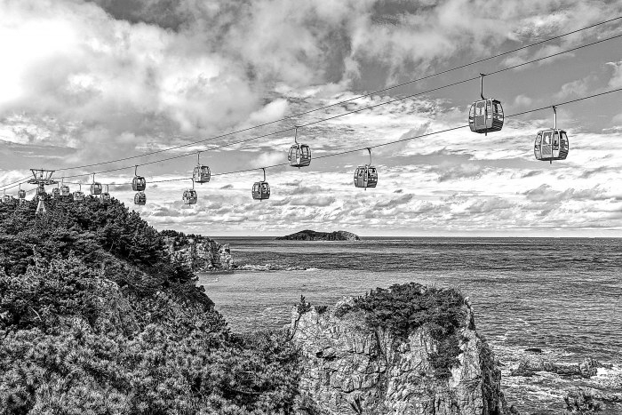 图③:10月7日,在山东省荣成市成山头风景区,游客乘坐缆车观景(无人机照片)。 新华社发(李信君摄)