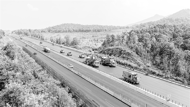 10月10日,由中铁十八局集团有限公司承建的樟吉高速公路改扩建工程A2标峡江县戈坪乡施工现场,工人正在进行沥青摊铺作业。