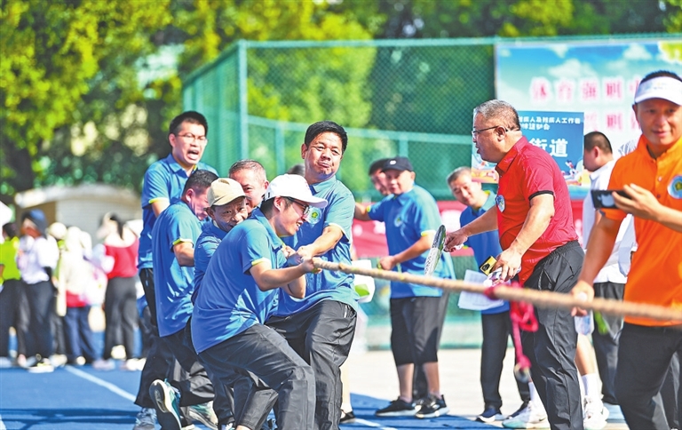 10月11日,在赣州市章贡区首届残疾人及残疾人工作者趣味运动会上,参赛选手正在进行拔河等趣味运动比赛,营造关爱残疾人的良好社会氛围。特约通讯员 胡江涛摄