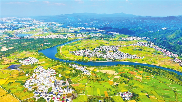 10月10日,大余县青龙镇二塘村,碧河如带蜿蜒穿境,田野黄绿交织铺展,远处青山层峦叠嶂,与澄澈蓝天、悠悠白云相映成趣。近年来,大余县以河(湖)长制、林长制为抓手,持续加码水利工程、农村公路等基础设施建设,全力改善农村人居环境,让田园风光与民生福祉同频共振。通讯员 叶相发摄